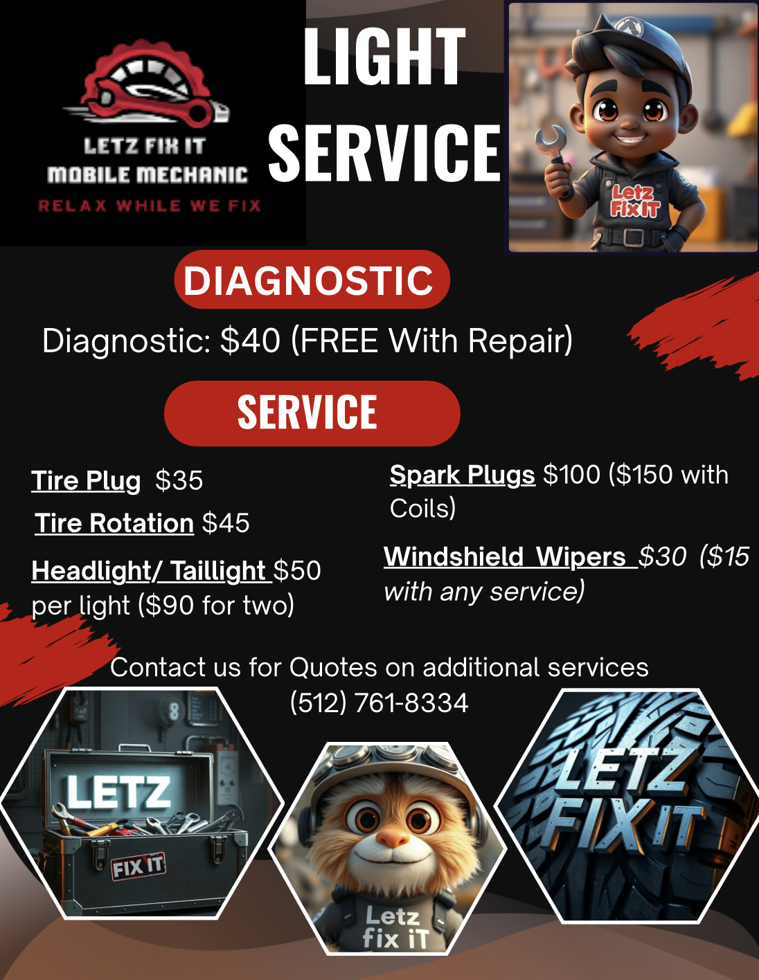 Letz Fix It Mobile Mechanic delivers fast, reliable, and convenient auto repair services directly at your location. Our certified technicians ensure your vehicle runs smoothly, saving you time and hassle. Choose us for expert care and transparent pricing every time.